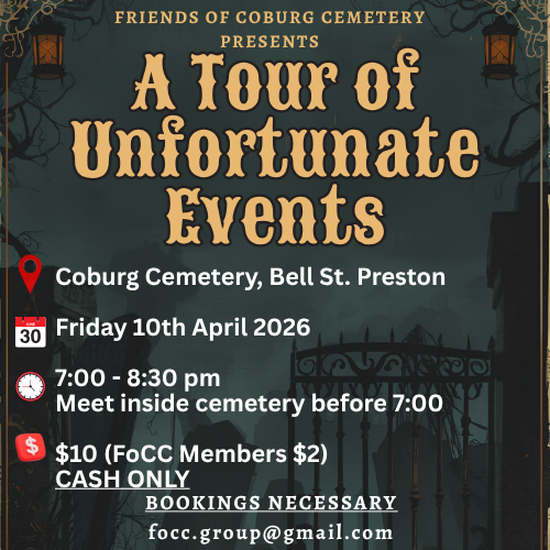This guided night tour uncovers lives cut short by accidents, disasters and cruel twists of fate. These are stories not previously told, drawn from real events and people buried at Coburg Cemetery. Many involve those who were young, unlucky, or simply in the wrong place at the wrong time. The setting and the stories combine to create an atmospheric and thought-provoking evening.